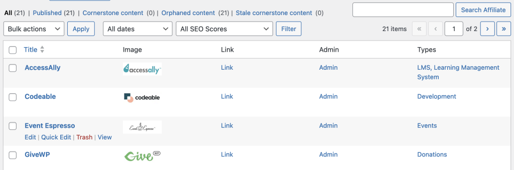 It creates a custom post type with custom fields for both the affiliate URL and the admin URL for it.